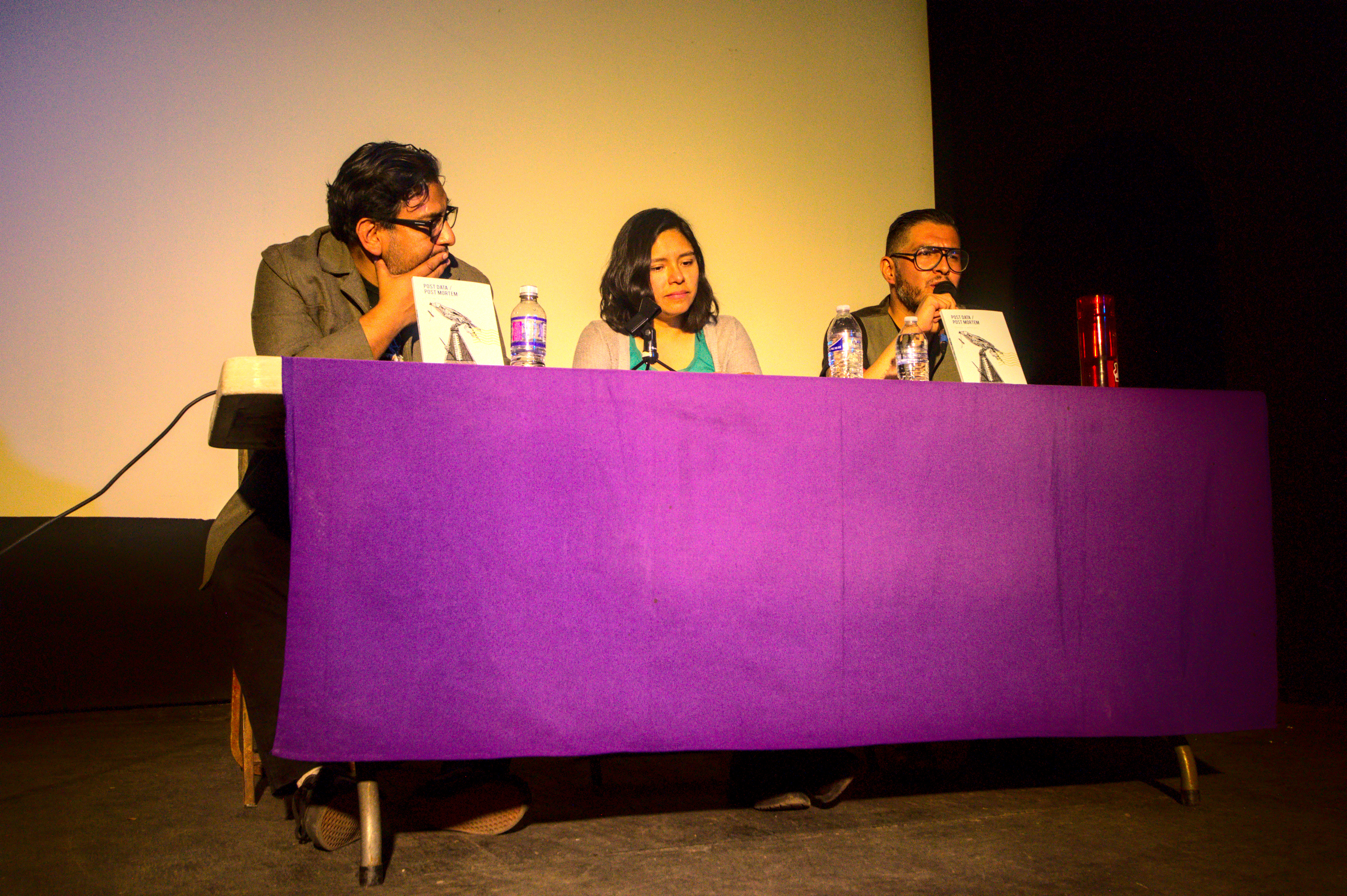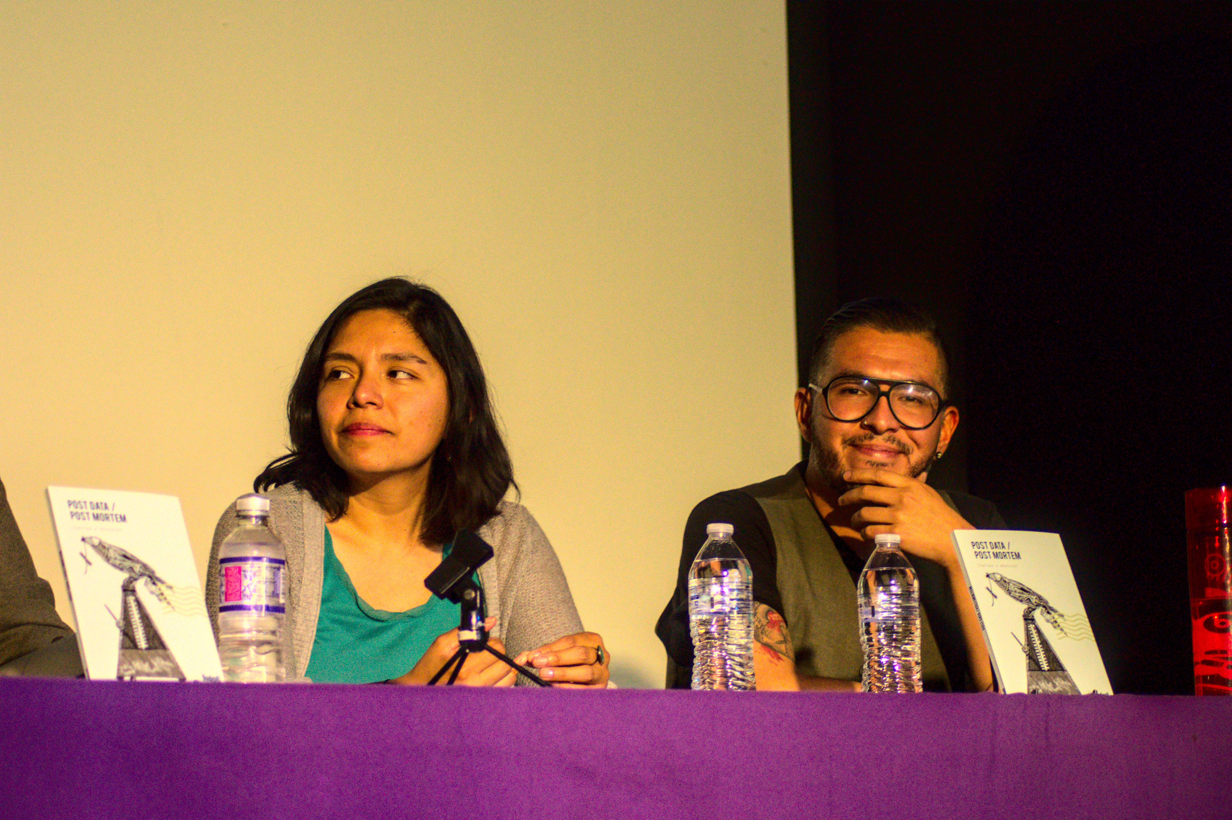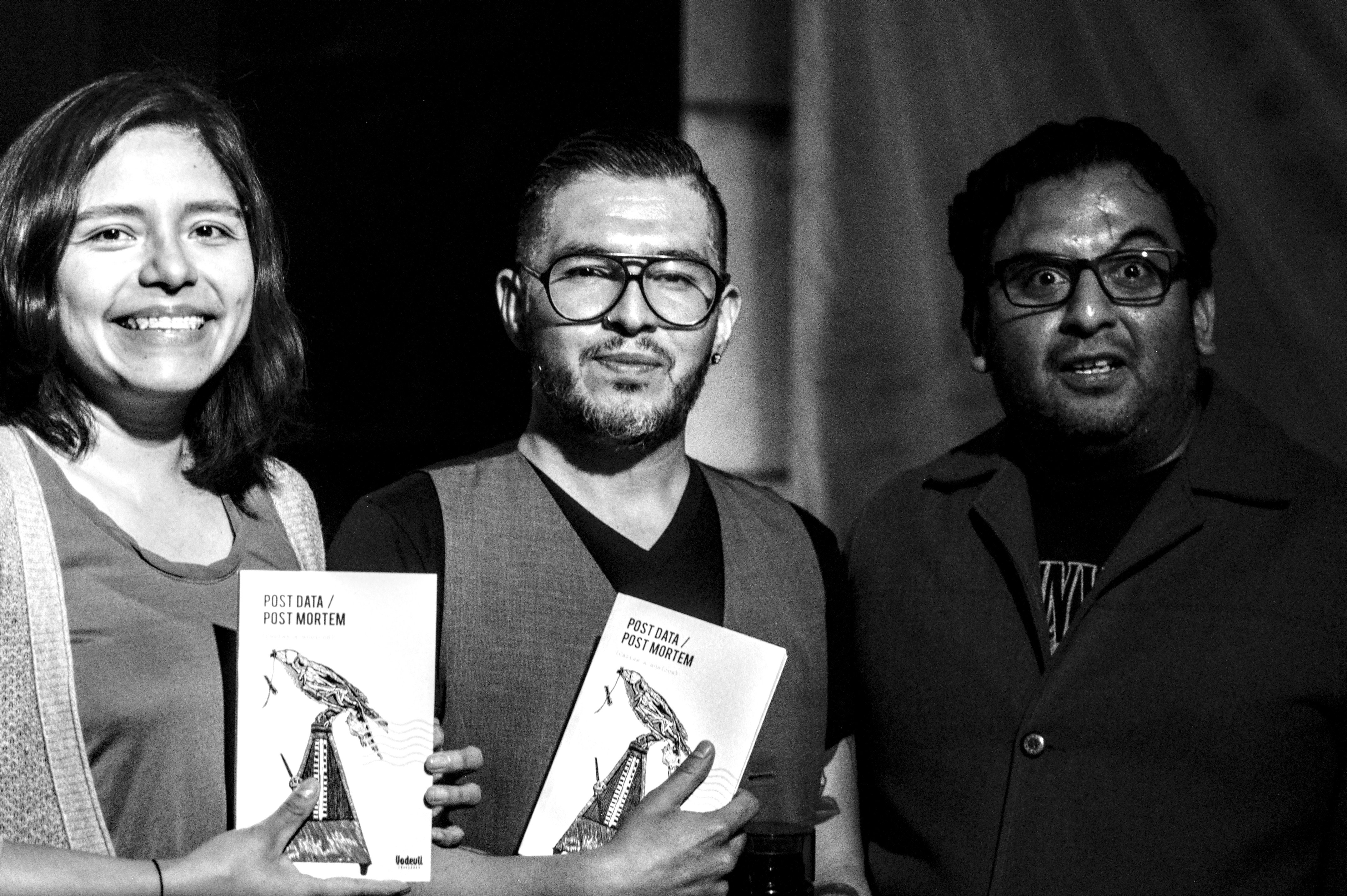 Compartir, no competir. Ese, más o menos, sería el lema de Post Data – Post Mortem (cartas a músicos), dijo ella. Recién lo habíamos platicado: en escritura no hay competencia, le dije (por más que los escritores quieran competir). Media hora antes el sol aún quemaba las frentes. Y un joven guitarrista-eléctrico tocaba sus canciones (aunque, tras agradecer el apoyo de los presentes, se fue luego de pronunciar el clásico: ‘ya me tengo que ir’, y no se quedó a ver la presentación). Marcela, Israel y Ricardo subieron al estrado entonces. La mesa los iluminaba bien; el público, me dijo ella, se veía oscuro desde ahí. Cartas a músicos muertos presentadas en un panteón. Qué mejor. Algunas lápidas arrumbadas por ahí. Algunos gatos paseándose. Un mantel morado. Faltan unas calaveras, le dije a Zindy, la anfitriona. Atrás hay unas, me contestó, y sonrió como suele hacer. Entonces los escritores no escritores (¡qué sacrilegio!) conversaron. Ella, Marcela, intervino después de Israel (vestido con un saco hermoso; voz cavernosa de borracho mítico, aunque tierno), quien con todo derecho leyó el texto introductorio (pues él lo escribió); ella, Marcela, me había dicho una noche antes que estaba nerviosa. Emocionada. Pues no sabía muy bien qué iba a decir. Yo permanecí en silencio. Relájate, le dije luego, lo harás muy bien. Y es que confío en ella especialmente para estas cosas. Entonces se soltó. Las palabras emergieron de su boca, esa que dibuja su maravillosa sonrisa, con toda la naturalidad y el profesionalismo posibles; esos que le ha dado la docencia, las mesas que ha moderado, las lecturas, las conversaciones académicas. Habló y movió las manos y el público (sí, cautivo) le aplaudió mucho y yo le aplaudí aún más. Tenía el corazón henchido (hinchado). Qué pinche emoción. Ricardo terció el momento. Sonrisa y peinado de galán, habló con toda la soltura de un hombre que se define a sí mismo como un no-melómano, pero que escucha tanto a Pink Floyd como a Rigo Tovar (a quien dedicó su carta). Ella, Marcela, se la dedicó a Charles Bradley. Ambos leyeron fragmentos de las mismas, privando a su público del deleite completo. Si hubiese estado arriba, pensé, los hubiese obligado a leerlas. Pero estaba abajo, donde me corresponde -a veces-, tomando fotos, presenciando el momento que de pronto se ensordeció entre rayos y truenos; un chubasco que apenas duró unos minutos.