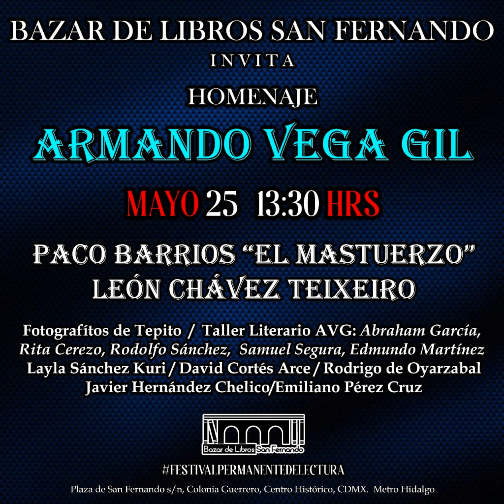 Para mí ese libro de Armando implica uno de los textos más transgresores de nuestra literatura. No solo por su fondo, sino por su forma; un texto que solo habría podido escribir un músico (además de fotógrafo, buzo, guionista, poeta, escalador de montañas), con una voz y un ritmo inusitados, cargadísimo de humor y doble sentido, de cacofonías y onomatopeyas que solo en los dedos de Vega Gil podían sonar tan bien. Ese trabajo suyo, el Diario íntimo de un guacarróquer, solo es comparable con su propia obra, diluida a veces para satisfacer ciertos criterios de ciertas editoriales. Solo Cuenta regresiva y otras fábulas supernumerarias -el volumen de cuentos con el que ganó el san Luis Potosí de cuento- o sus microficciones, como las de la pareja triste, contenidas en libros como La ciudad de los ojos invisibles, pueden alcanzar esos cotos de ingenio, de flexibilidad, de lenguaje estrictamente literario. Por lo tanto libre, por lo tanto avieso. Ahora que escribo esto me recuerdo en su taller, donde pudo firmarme por segunda vez el Diario íntimo: rodeados por libros, por cuadros, por instrumentos, nos sentábamos en lo que debía ser el comedor de su departamento. Su estudio asomaba a un lado. Armando preparaba el café, la mayoría de las veces soluble. El Dok, que está aquí en esta mesa, llevaba unos cocoles desde su cercana Amecameca. Al Dok fue al primero de los talleristas que conocí. Estaba ahí afuera, esperando, poco antes de que dieran las 10 de la mañana. Leía algo, un libro de Bukowski. ¿O era yo quien llevaba aquel libro? Armando salió unos minutos después. Llevaba el cabello húmedo. Me recuerdo viéndolo, emocionado, como se le ve a un ídolo. Dijo mi nombre. Dijo bienvenido. Me sonrió. Le sonreí. Aquel era un sueño hecho realidad. Armando nos flanqueó el paso y el Dok y yo entramos. Ya preparaba el agua para el café. Nos sentamos cada quien en una de las sillas entorno a la mesa. Yo procuré elegir siempre la misma. Aún recuerdo que desde ahí, en las últimas sesiones que tuvimos, me perdí de tomarle una foto con su gato. Se me escapa el nombre del felino. Me caía muy bien, era un macho blanco y negro. Más negro que blanco. Una vez le pedí prestado un libro de Maupassant. No pude devolvérselo. Lo conservo con cariño; sin duda es un autor que me recuerda a Armando, uno de los mejores cuentistas que ha dado México. De los más ágiles e impertinentes, de los más arrojados. De los más tiernos, de los más cursis, de los más rebeldes. Todas esas cualidades que deberían tener, en mi opinión, los escritores de cuentos. Lejos de lo solemne. Ese era Armando y lo dejaba ver en los comentarios que hacía de los textos de sus pupilos. Lo recuerdo siempre atinado, siempre dando una opinión que hacía crecer enormidades aquel texto. Así fue como nació, o renació, mi segunda novela en su taller. Bajo su cobijo y mentoría. Con su acompañamiento, con sus porras para que la metiera a un concurso que terminé ganando y que luego él presentó conmigo. Qué digo sueño, un sueño se queda corto; estoy hablándoles de una de las experiencias más gratas de mi vida. Que se vio opacada, un instante, por una de las más culeras. Y que sucedió unos meses después. Solo tres meses después.