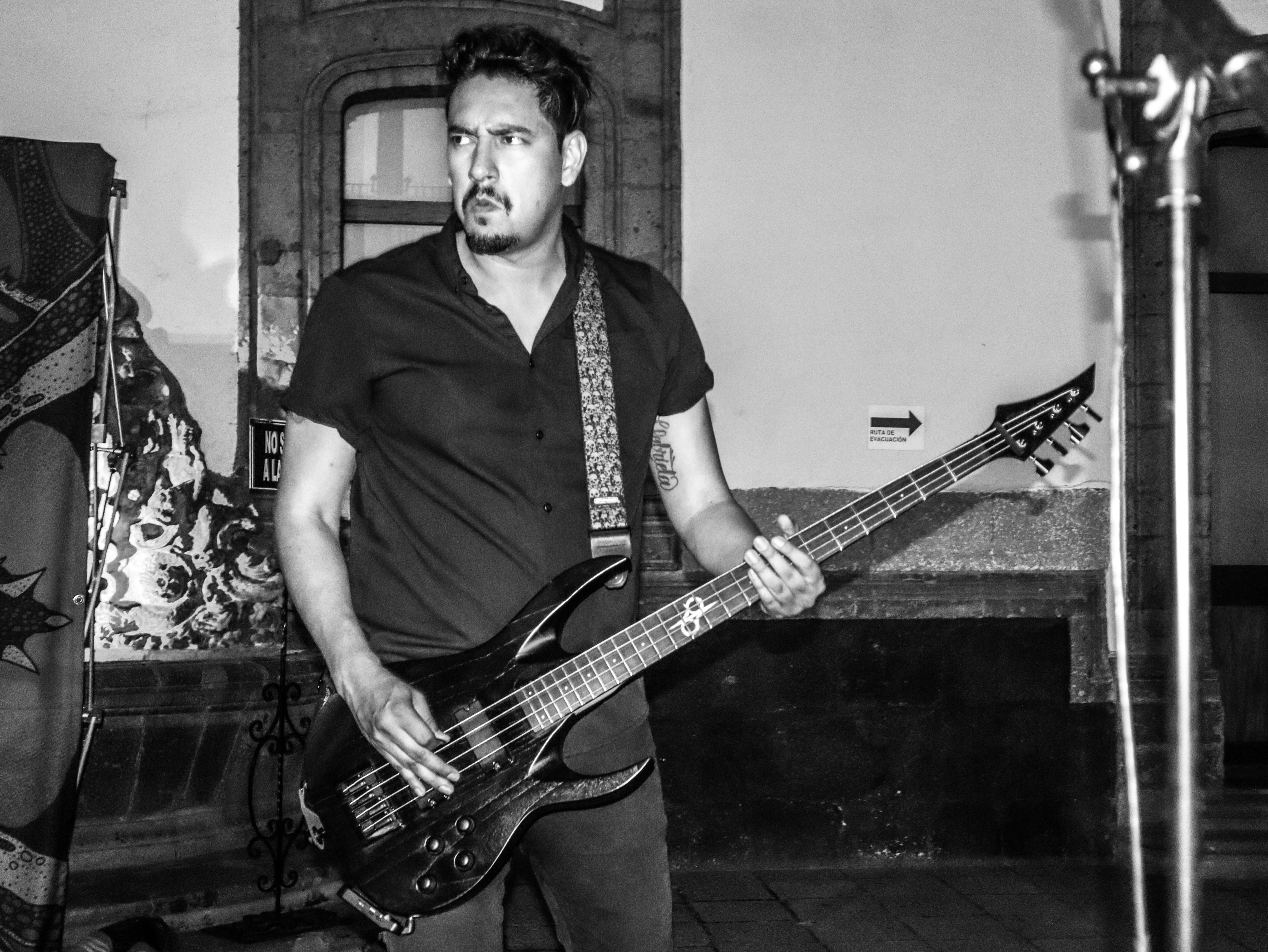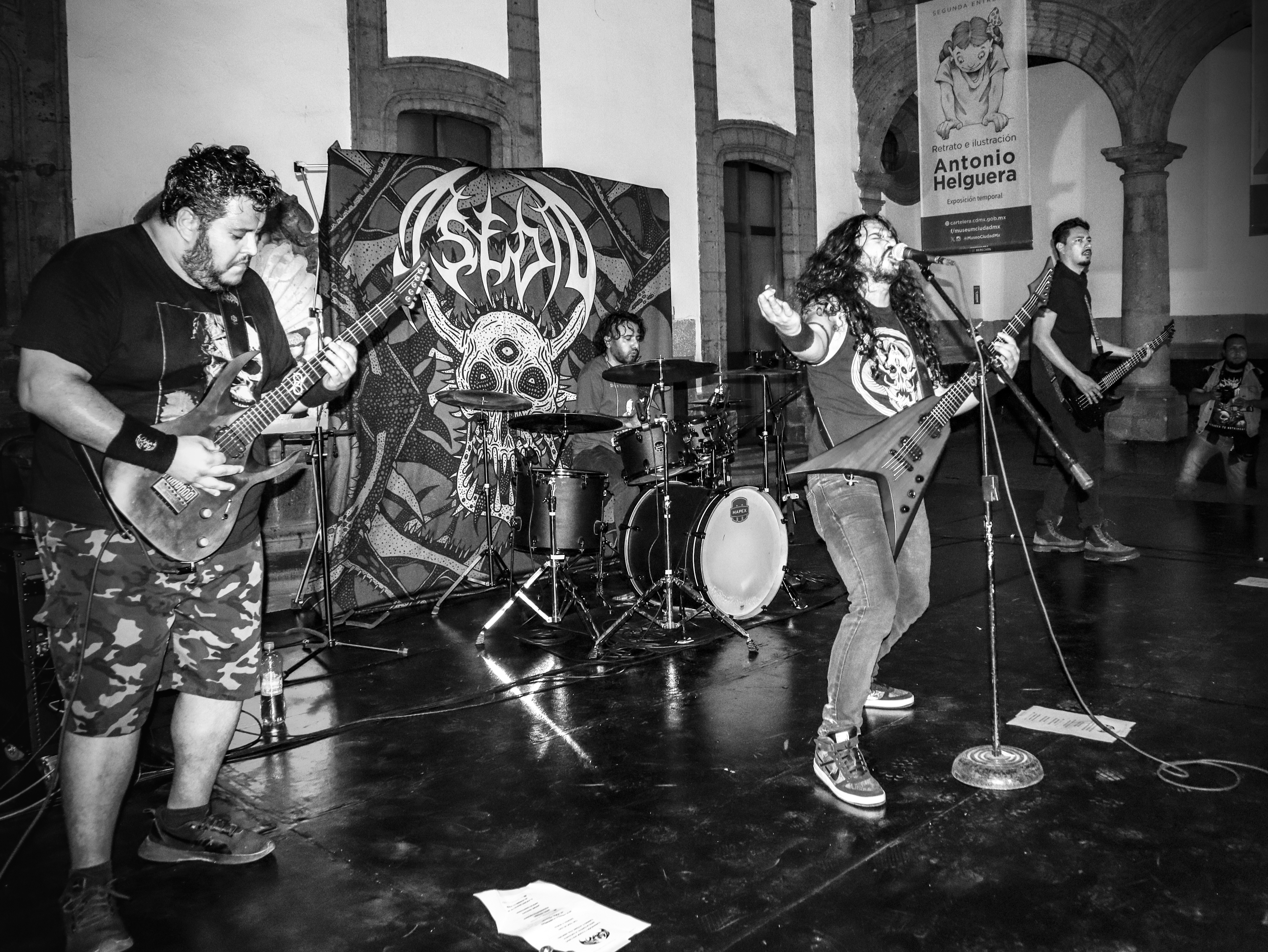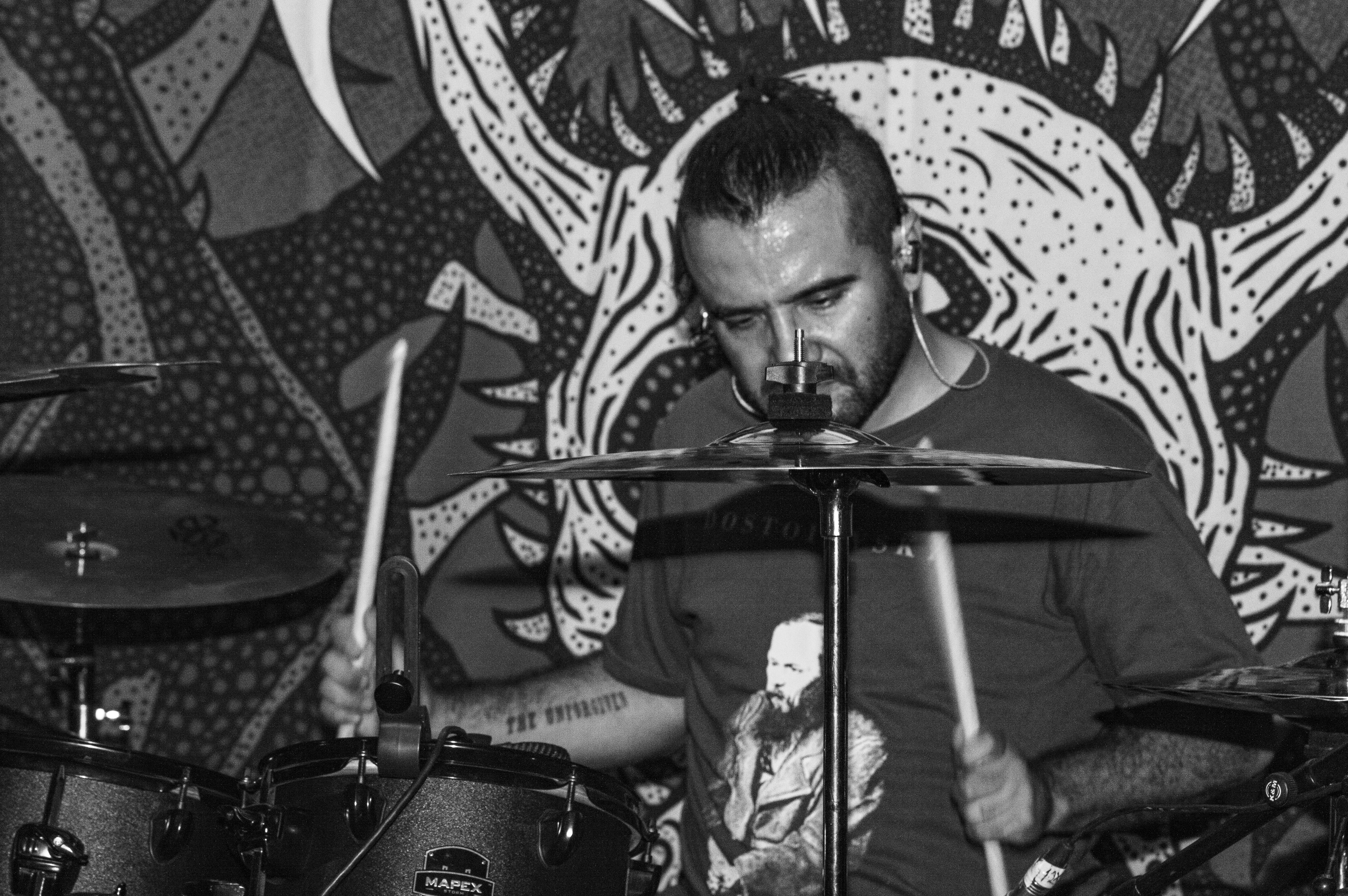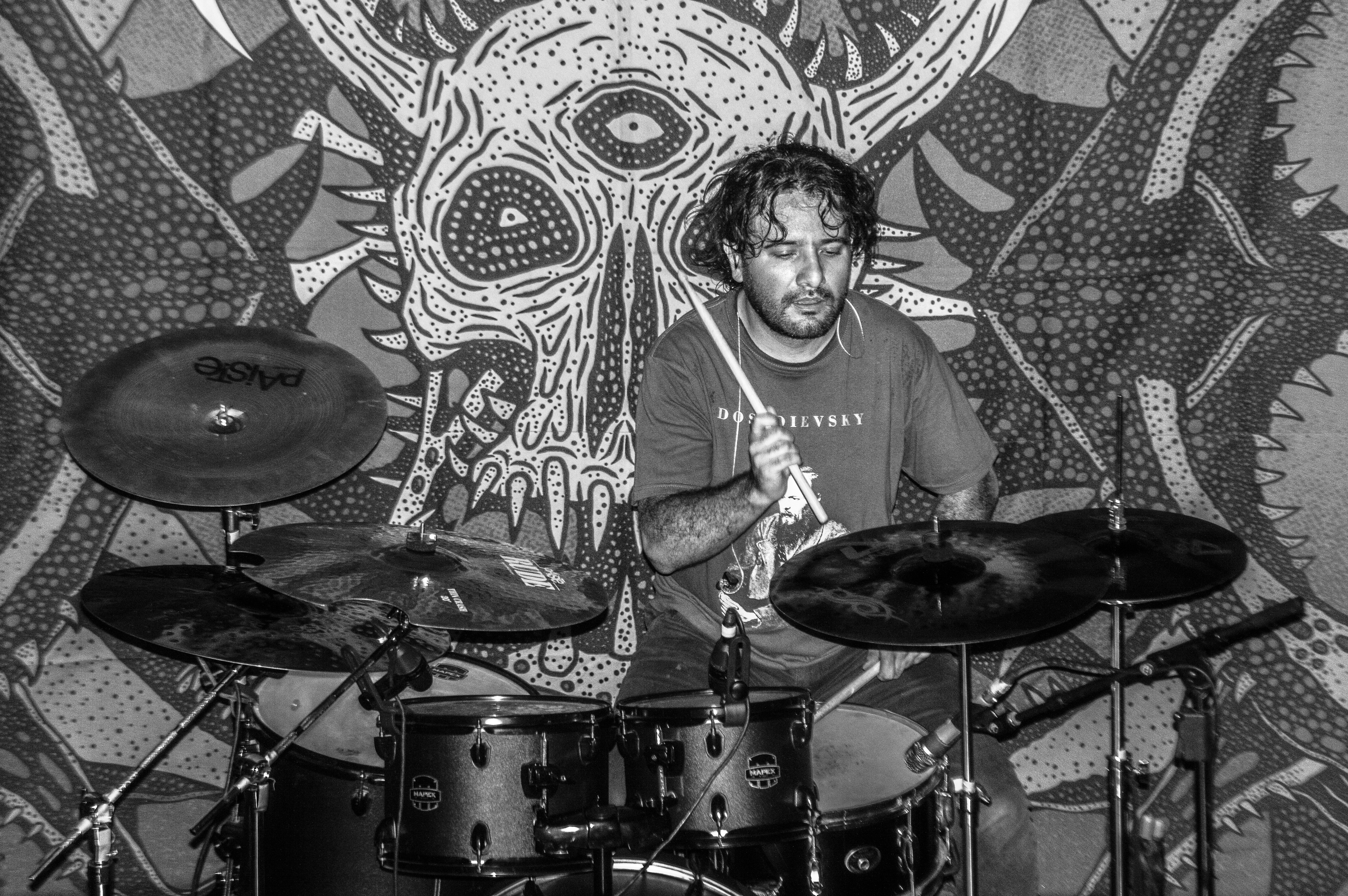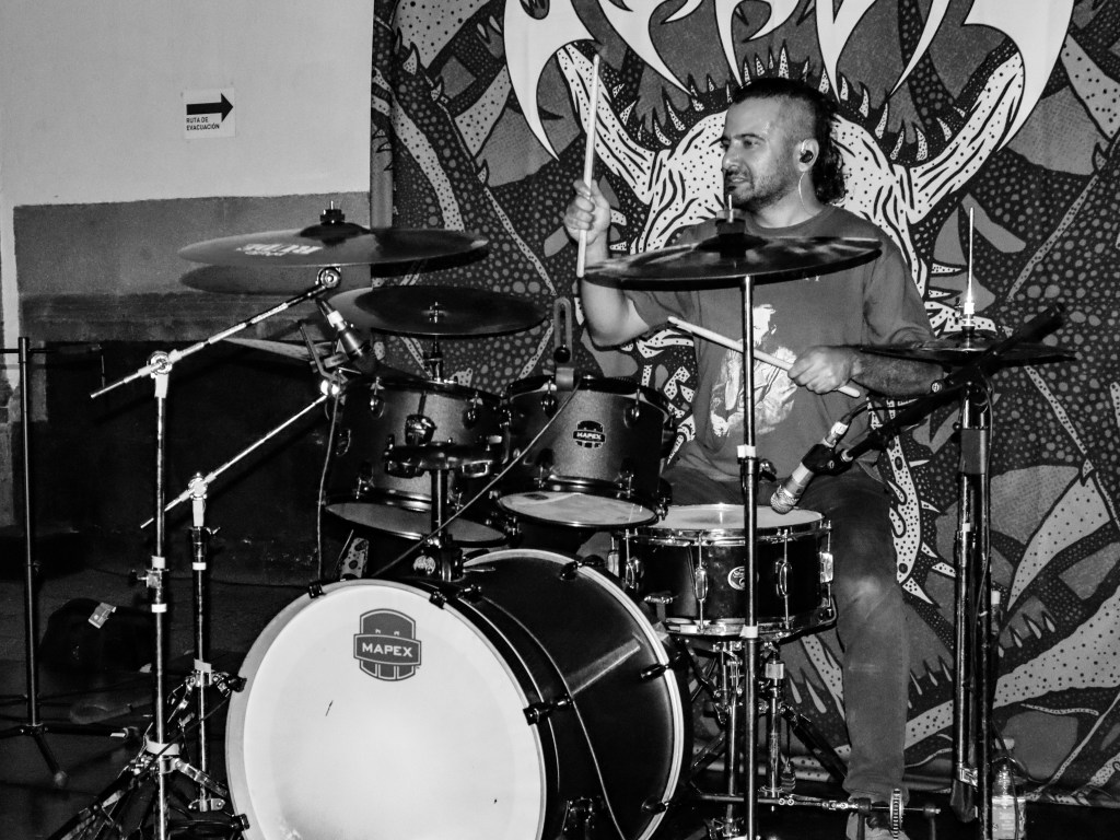 ¿Por qué no le pones un nombre?, me preguntó Armando una vez, en el taller, y luego me contó que él nombraba a todos sus instrumentos (tocaba piano, bajo, guitarra, ukulele…). La verdad es que yo, de los dos que había tenido, a ninguno lo había bautizado. (A ninguna, en realidad, porque baterías.) Fue así que brotó, de algún rincón de mi gañote, sin más, el nombre de Roberta. Y así le puse a la batería de la protagonista de Metal; es el único personaje en esas páginas que tiene nombre propio. Le agarré cariño y por eso también le puse así a mi tercera batería (cuarta, porque no puedo no contar a E-Roberta, la electrónica), que me vendieron Bruno y Dalia. Estas imágenes pertenecen a su debut (que casi no se logra, acá el porqué). El Gabriel y el Emmanuel la armaron chingón. Sonó al tiro. Le pegué recio (y me desfogué). Es probable que grabe en ella lo nuevo de Asedio. Ojalá. Como sea, le doy las gracias. Y se las presento. ![]()