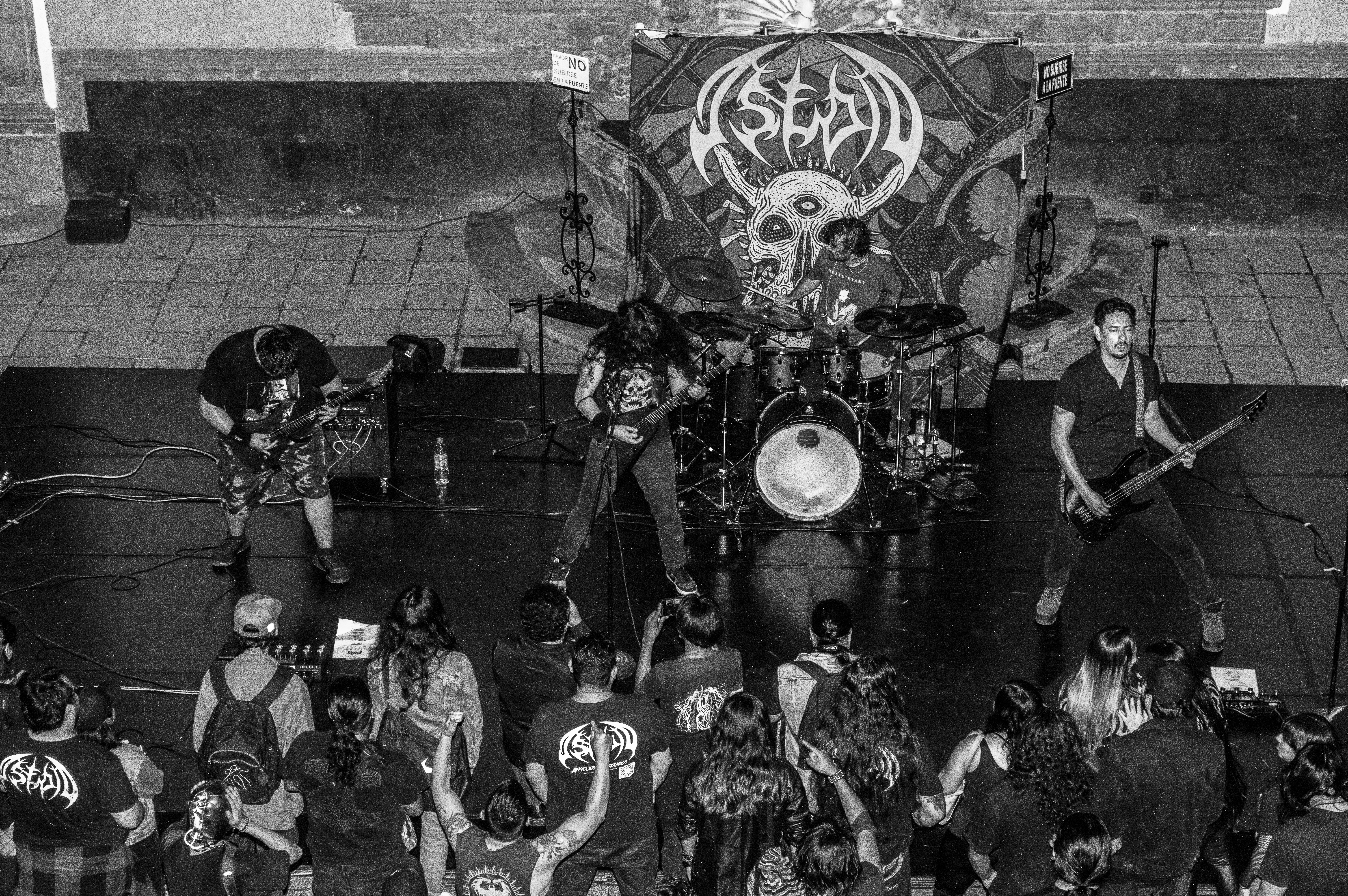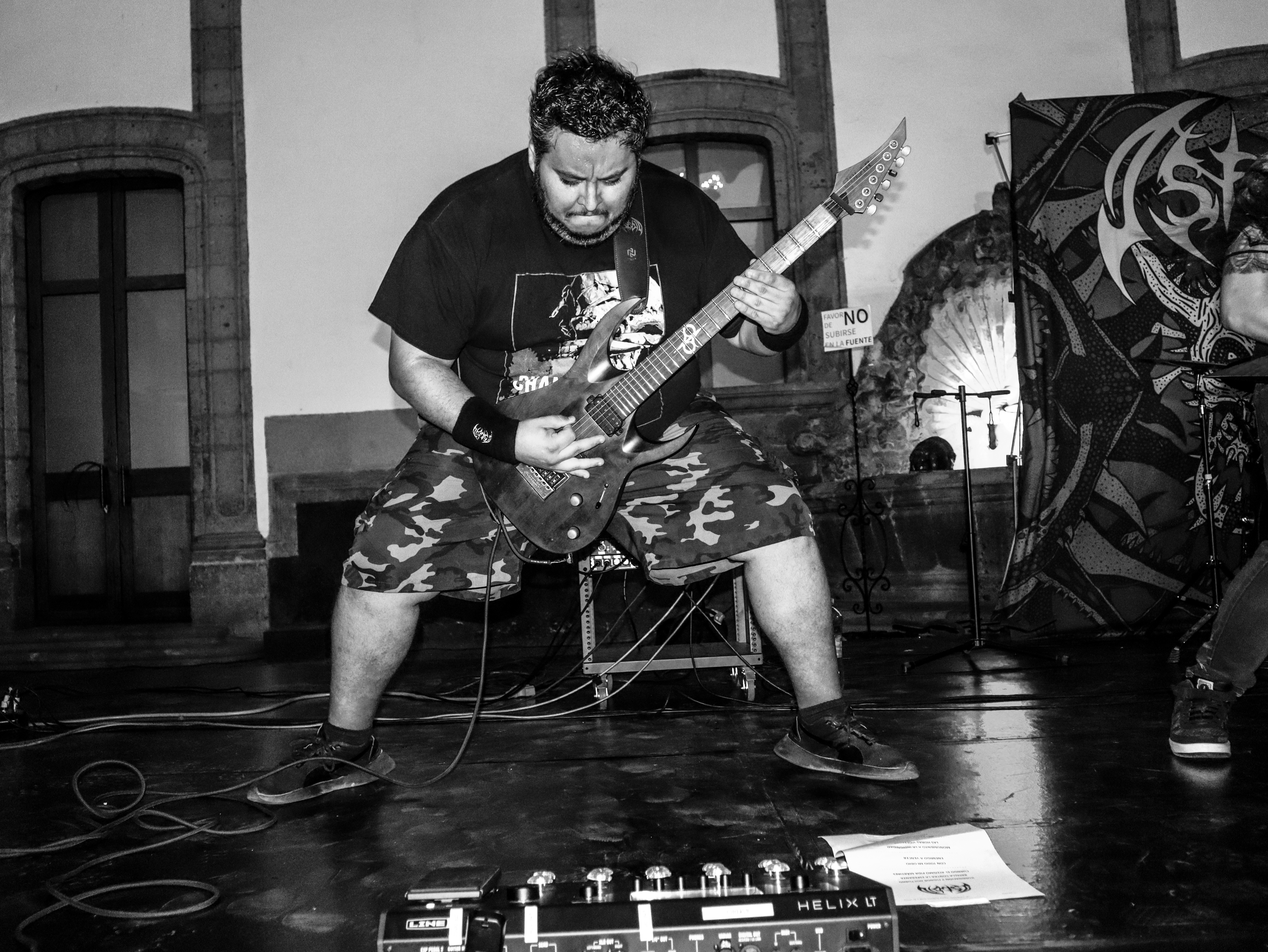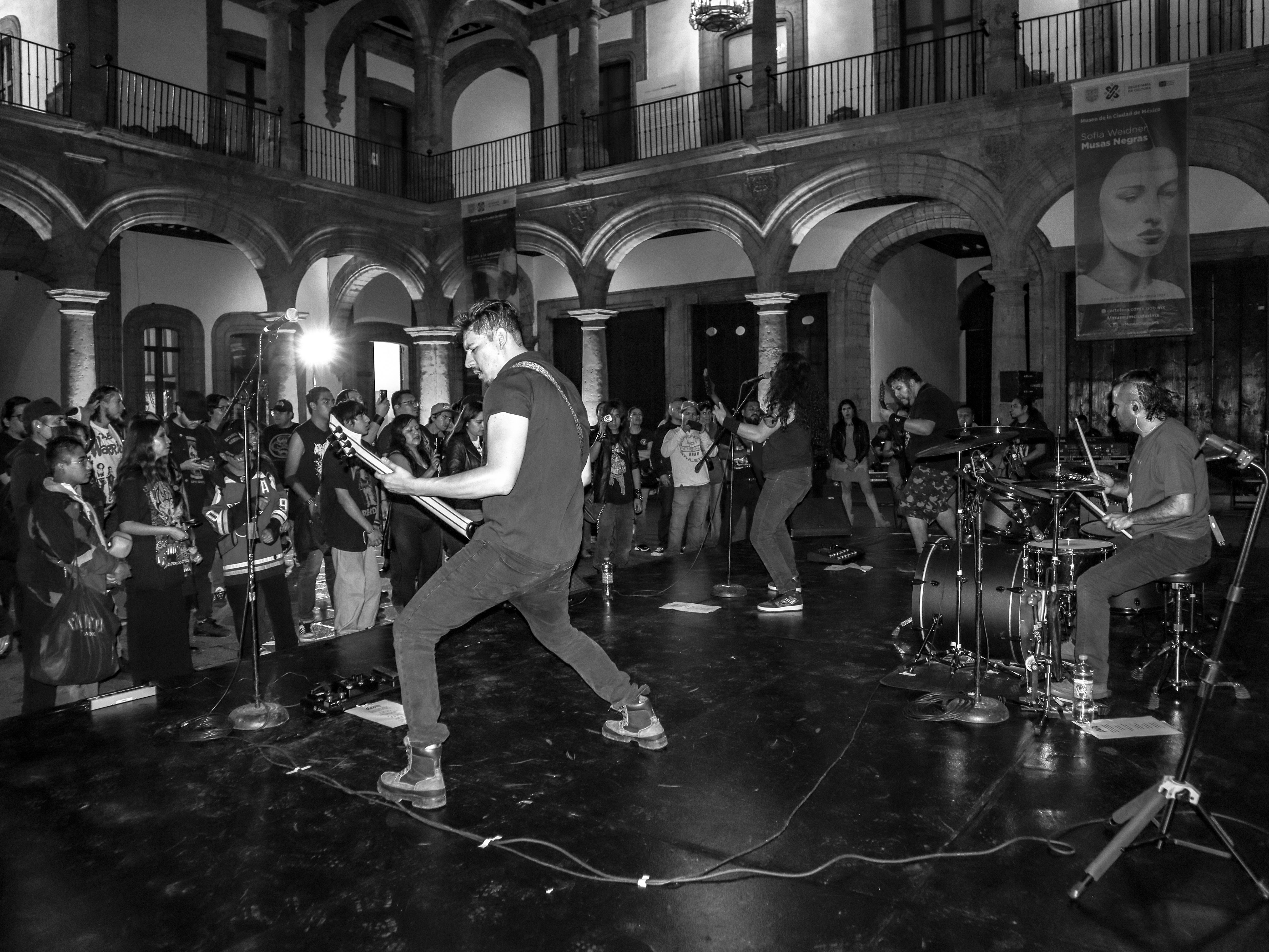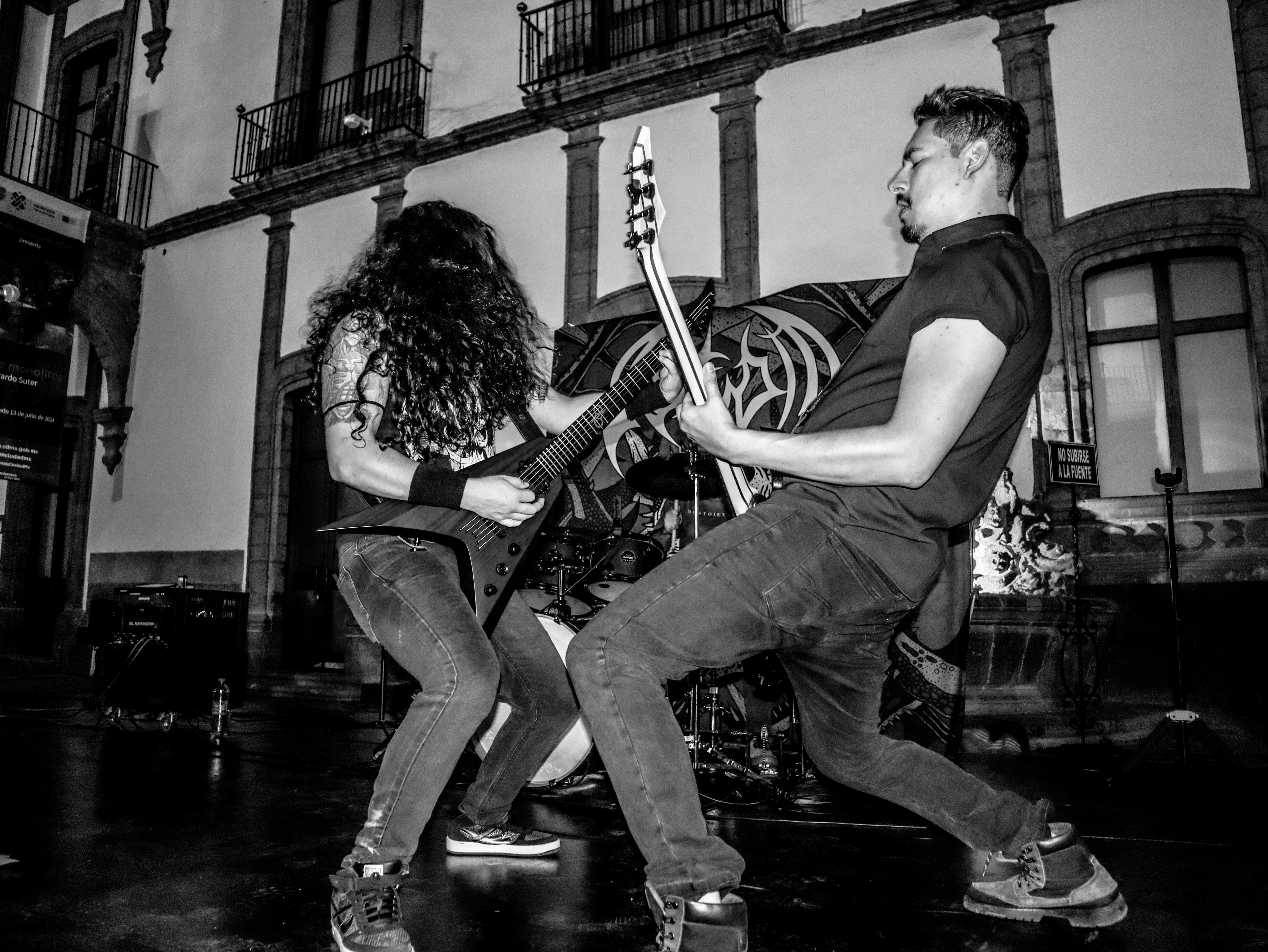 ¿Por qué no le pones un nombre?, me preguntó Armando una vez, en el taller, y luego me contó que él nombraba a todos sus instrumentos (tocaba piano, bajo, guitarra, ukulele…). La verdad es que yo, de los dos que había tenido, a ninguno lo había bautizado. (A ninguna, en realidad, porque baterías.) Fue así que brotó, de algún rincón de mi gañote, sin más, el nombre de Roberta. Y así le puse a la batería de la protagonista de Metal; es el único personaje en esas páginas que tiene nombre propio. Le agarré cariño y por eso también le puse así a mi tercera batería (cuarta, porque no puedo no contar a E-Roberta, la electrónica), que me vendieron Bruno y Dalia. Estas imágenes pertenecen a su debut (que casi no se logra, acá el porqué). El Gabriel y el Emmanuel la armaron chingón. Sonó al tiro. Le pegué recio (y me desfogué). Es probable que grabe en ella lo nuevo de Asedio. Ojalá. Como sea, le doy las gracias. Y se las presento. ![]()
